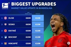 体育资讯3月30日讯 《转会市场》在此前更新了德甲球员身价,并列出了身价升值幅度最大情况,奥利塞等3人领衔。